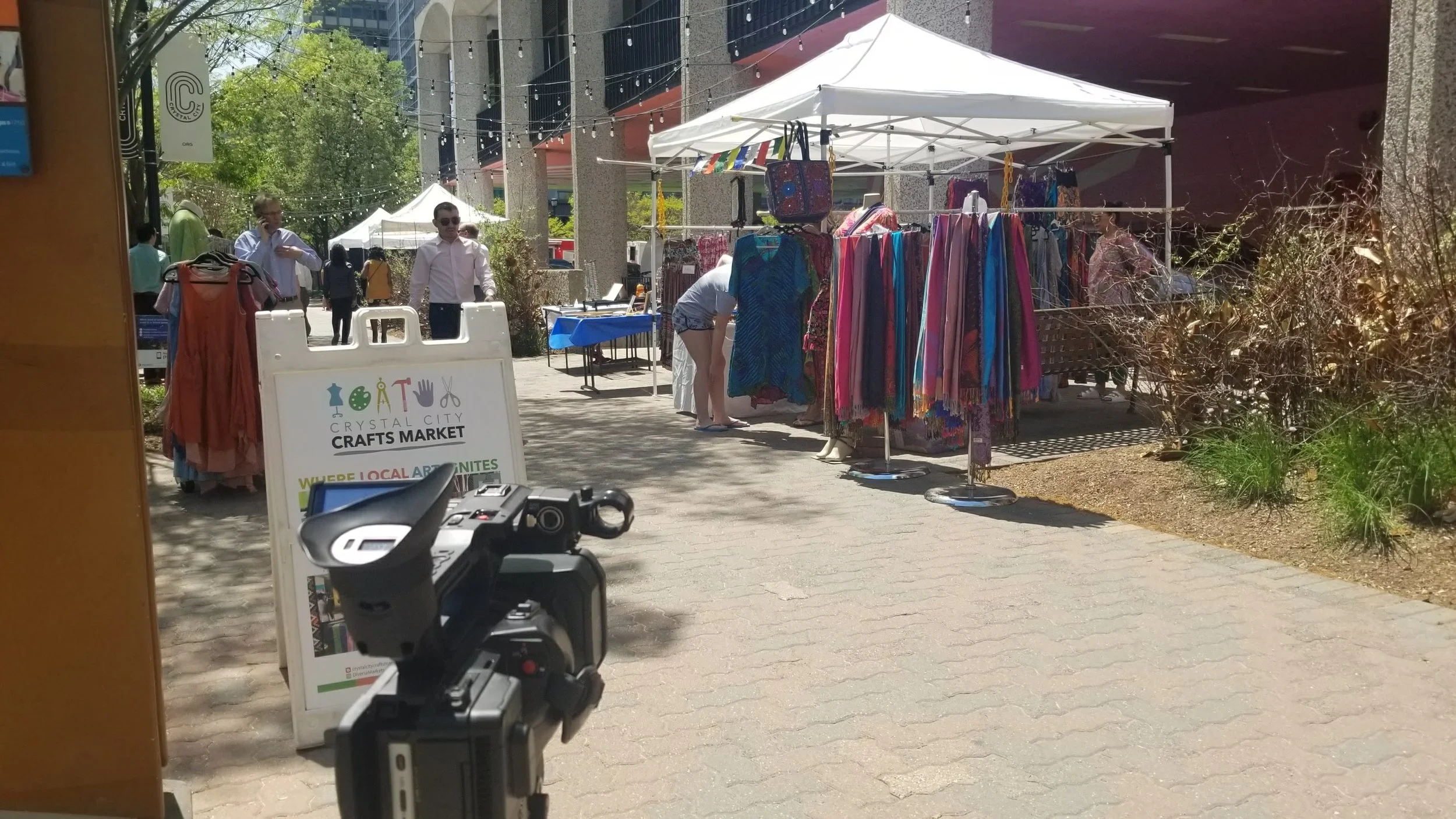 Another key to time lapse with the HC-X1 in particular is keeping the camera out of the way of people. The tripod legs have to be fairly wide for stability and the camera is big. Don't set up in the middle of the sidewalk and have people walk around. Find an area where people aren't walking, like next to a tree, or behind a sign and try to get your shot that way. The sign in the image below was a great "people blocker" and set the scene for the time lapse giving it a title "Crafts Market".