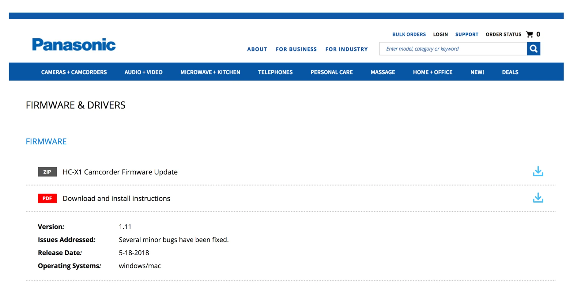On May 18th, 2018, Panasonic released a Firmware Update for the Panasonic HC-X1 4K Video Camera. It is available via free download on Panasonic's website (sort of...keep reading). Unfortunately, the update only seems to fix some unnamed minor bugs and does not bring any major changes to the camcorder.